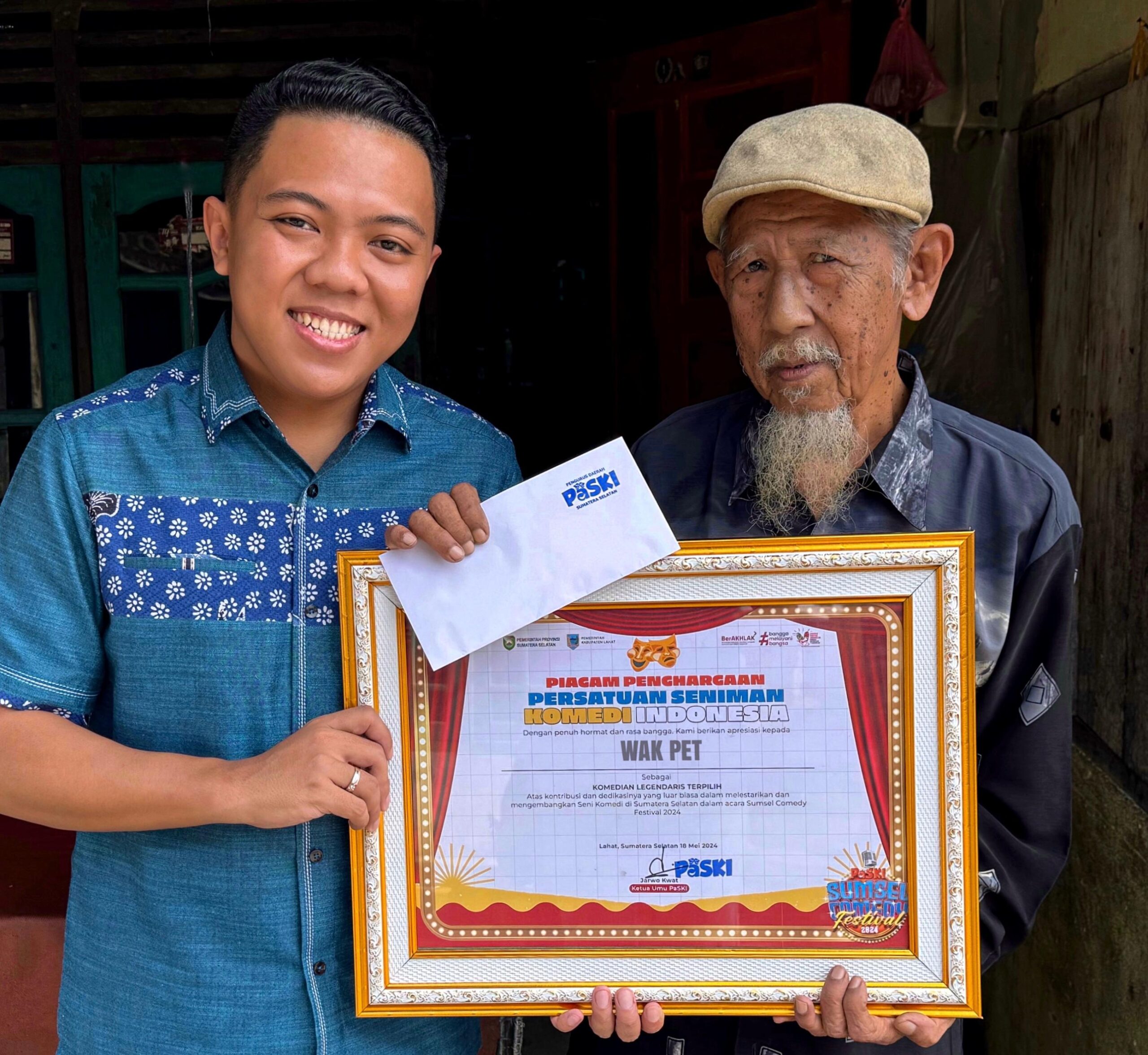 LIDIK.ID, Palembang – Kiagus Abdul Wahab atau lebih dikenal masyarakat Sumsel dengan nama panggung Wak Pet, penekun kesenian Dul Muluk dari tahun 1963 mendapat piagam penghargaan sebagai Komedian Lengendaris Terpilih dari Persatuan Seniman Komedi Indonesia (PaSKI) yang diserahkan secara simbolik oleh Jarwo Kwat selaku ketua PaSKI Pusat kepada anak Wak Pet yaitu Cek Roni di malam puncak hiburan rakyat HUT Kabupaten Lahat.